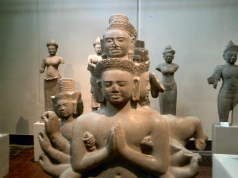 Die Dreifaltigkeit im Hinduismus (hier aus dem Nationalmuseum in Pnom Penh in Kambodscha): Links die Darstellung der hinduistischen Dreifaltigkeit. Unten ist der Lingam (Phallus) viereckig, Symbol des Urgrunds von allem, des Gottes Brahma, darüber achteckig, Symbol des Gottes Vishnu, der uns durch seine immer neuen Wiedergeburten erlöst hat, der also immer bei uns ist, und oben als Kuppe, Symbol des Gottes Shiva, des Gottes des Geistes, der uns immer wieder aufs Neue inspiriert. Rechts neben dem "Dreifaltigkeitslingam" ein Lingam in einer Yoni, also in einer symbolisierten weiblichen Vulva.