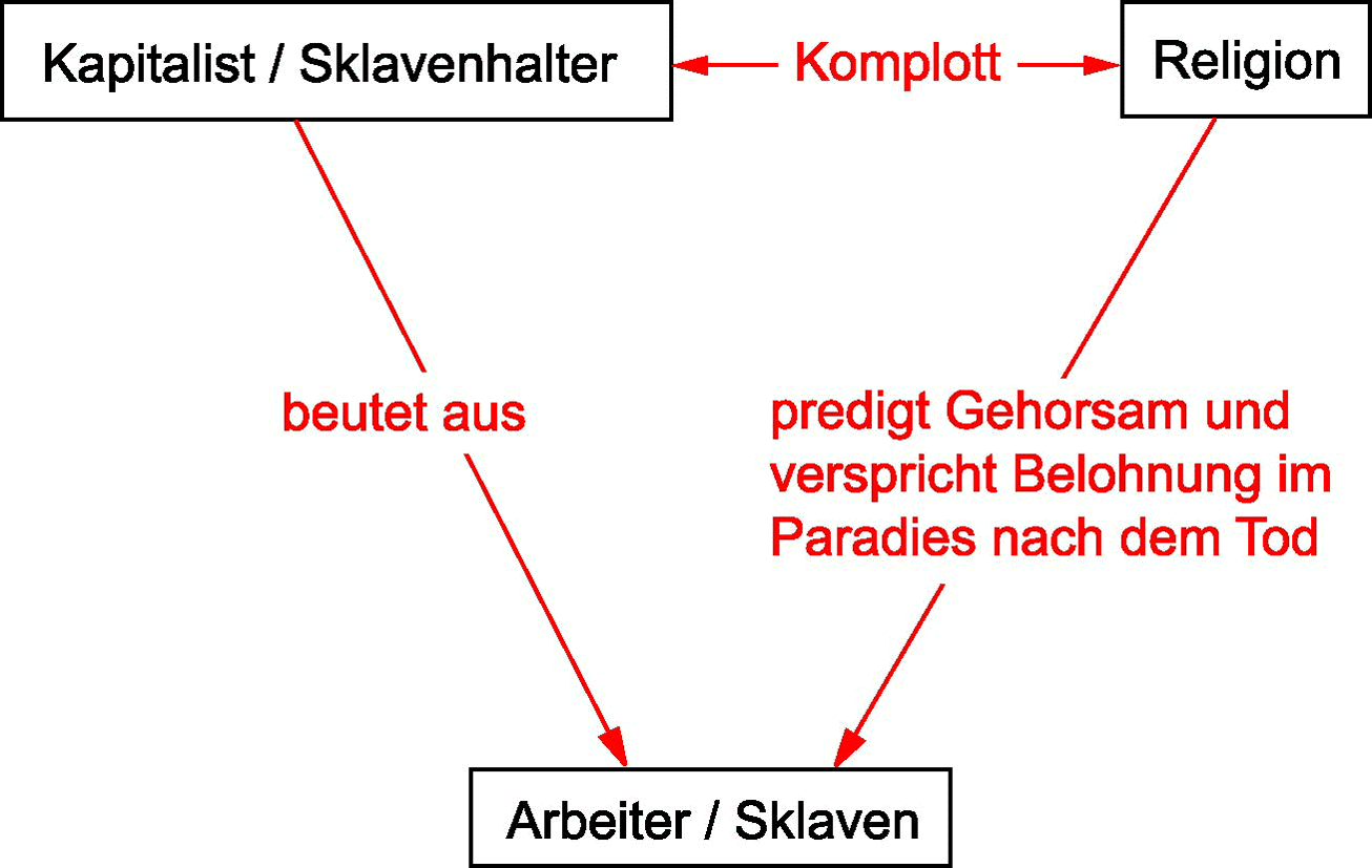 Anmerkung: Bitte dem Verfasser von basisreligion nun nicht marxistisches Denken unterstellen! Das Denkschema nach Karl Marx diente lediglich als Anregung, einmal zu überprüfen, wie das nun wirklich ist! Und noch etwas: Dieses Stichwort mit den beiden schematischen Darstellungen wurde erst im Juli 2005 eingefügt, also einige Jahre nach Beginn der Website. Wäre dieses Stichwort gleich am Anfang da gewesen, hätte einiges anders formuliert werden können. Und nun muß das so nach und nach umgebaut werden. (Wörterbuch von basisreligion und basisdrama) |